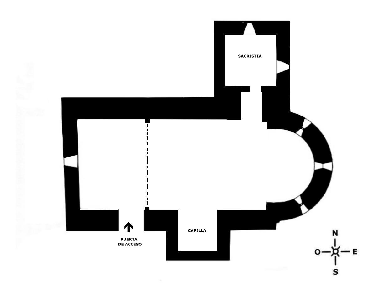 de un pasillo cubierto con bóveda de cañón. Esta capilla se ilumina por dos pequeñas ventanas adinteladas, una de ellas en el muro Este y la segunda en el muro Norte.